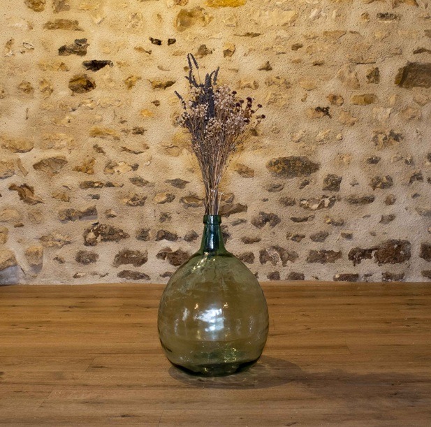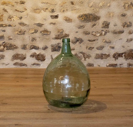 Dame-jeanne en verre légèrement vert transparent, idéale pour décorations au sol ou compositions florales. À associer avec autres dame-jeanne ou vases pour un ensemble harmonieux.