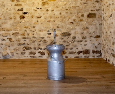 Fontaine originale détournée d’un pot de lait, parfaite pour un coin boissons au style rétro. Idéale pour le punch ou jus. À associer avec bar et caisses en bois.