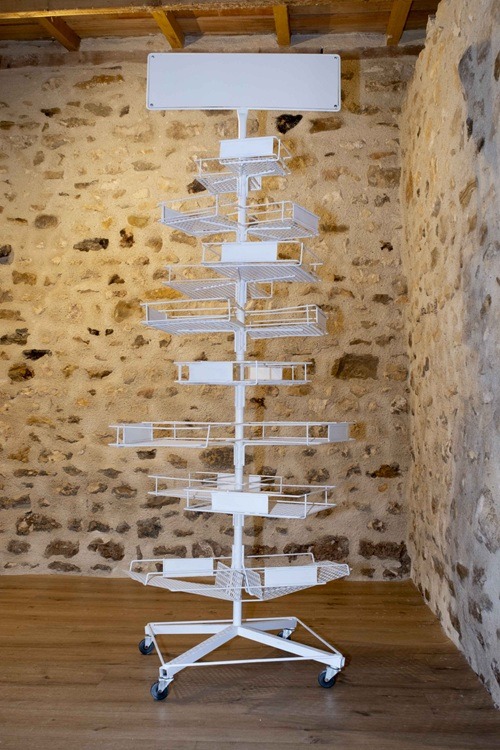Grand présentoir blanc comportant une dizaine de paniers, idéal pour buffet, coin gourmandises ou cadeaux, ou pour une mise en scène de lancement de produit.