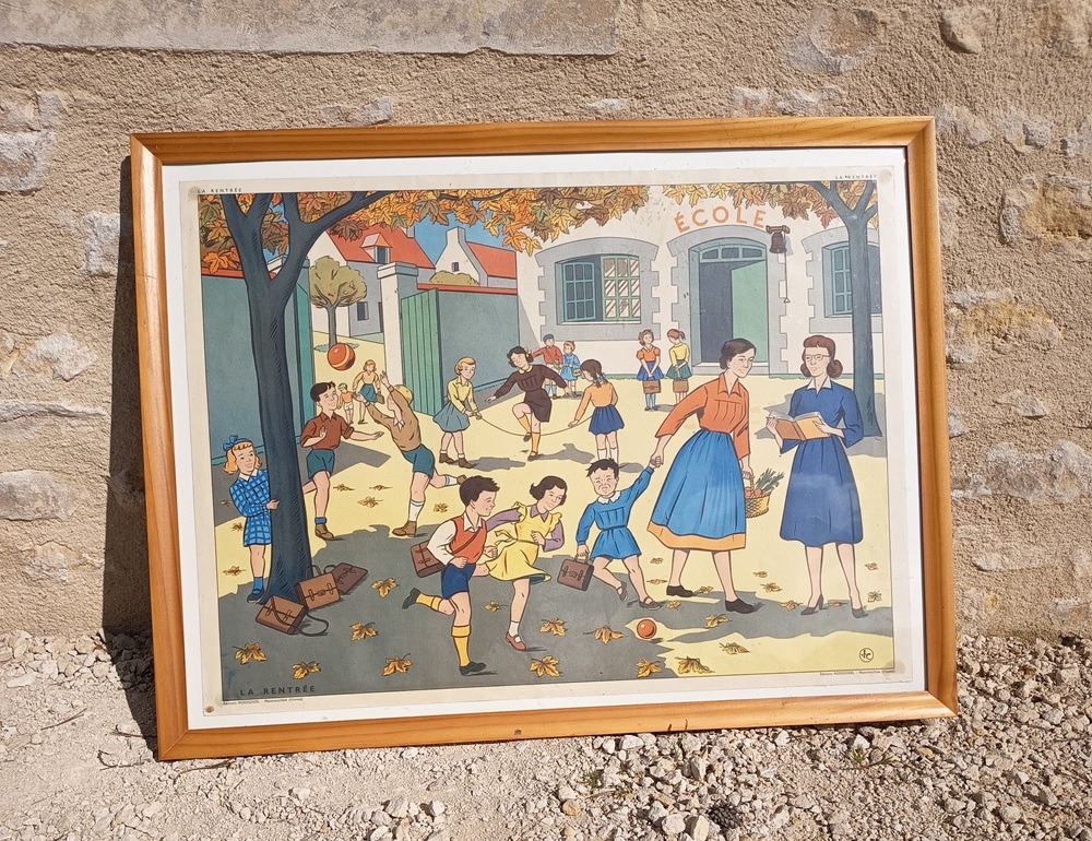 Tableau ancien illustrant des enfants à l’école, empreint de nostalgie et de charme rétro. Idéal pour ponctuer une décoration vintage ou créer un coin thématique original lors de vos événements.